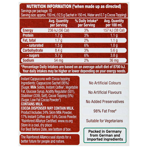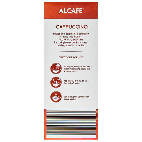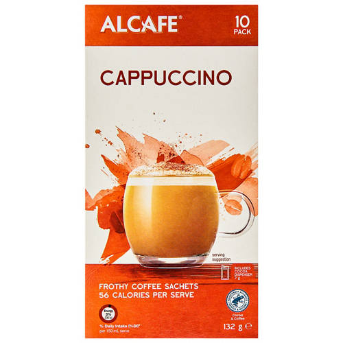 Indulge in our Alcafe Cappuccino for a creamy café experience at home. With no artificial colours or preservatives, just add hot water for a quick coffee break.