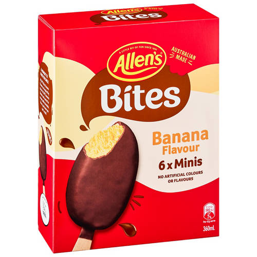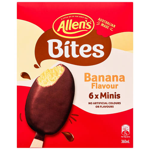 Inspired by your favourite banana lolly, Allen's Bites Banana feature a creamy banana flavoured centre coated in milk chocolate. The perfect bite sized treat for all ages!