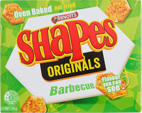 Arnott's Shapes Barbecue Biscuits are a flavoursome and fantastic treat. No artificial colours. Foil wrapped for freshness. Oven baked, not fried. Made in Australia.