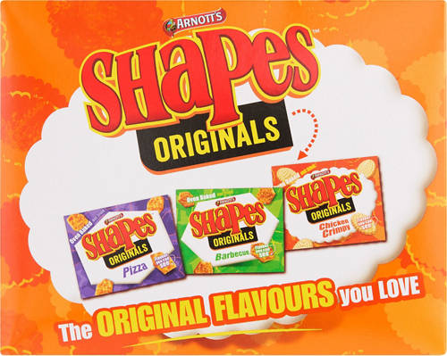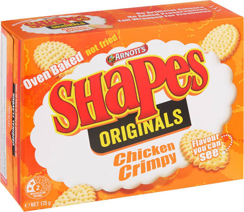 Arnott's Shapes Biscuits Chicken Crimpy is a flavoursome and a fantastic treat. No artificial colours or preservatives. Foil wrapped for freshness. Oven baked not fried. Made in Australia.