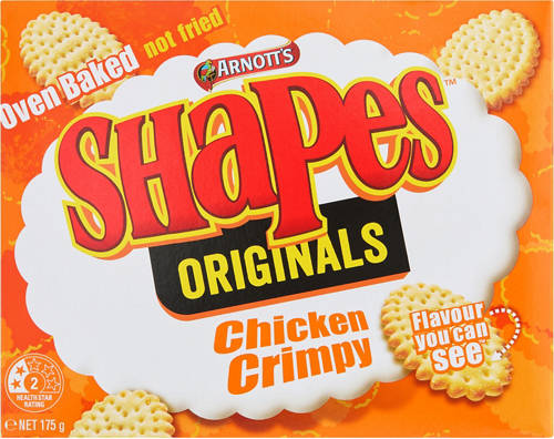 Arnott's Shapes Biscuits Chicken Crimpy is a flavoursome and a fantastic treat. No artificial colours or preservatives. Foil wrapped for freshness. Oven baked not fried. Made in Australia.