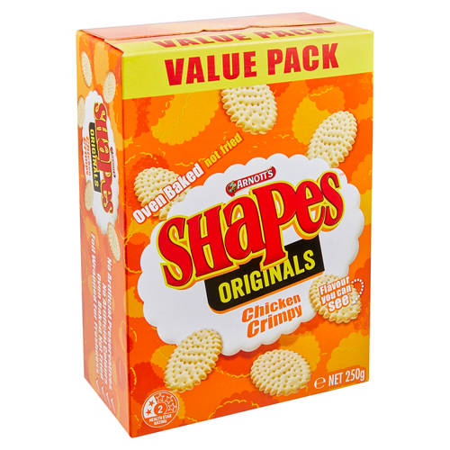 Arnott's Shapes Biscuits Chicken Crimpy is a flavoursome and a fantastic treat. No artificial colours or preservatives. Foil wrapped for freshness. Oven baked not fried. Made in Australia.