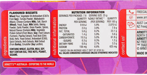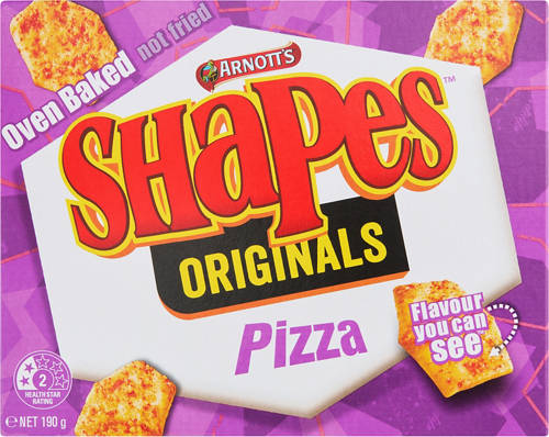 Arnott's Shapes Pizza Biscuits is a flavoursome and a fantastic treat. No artificial colours, flavours or no artificial preservatives. Foil wrapped for freshness. Oven baked not fried. Made in Australia.