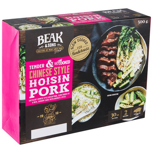 Succulent Chinese Style hoisin pork, slow cooked in a rich, savoury sauce with aromatic spices. No Artificial Colours or Flavours.