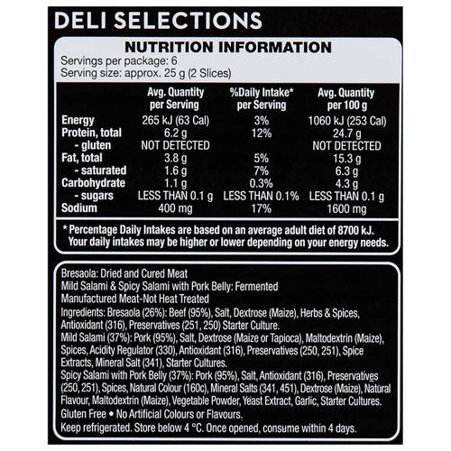 A selection of deli meats, including, Bresaola, Mild Salami and Spicy Salami with Pork Belly.