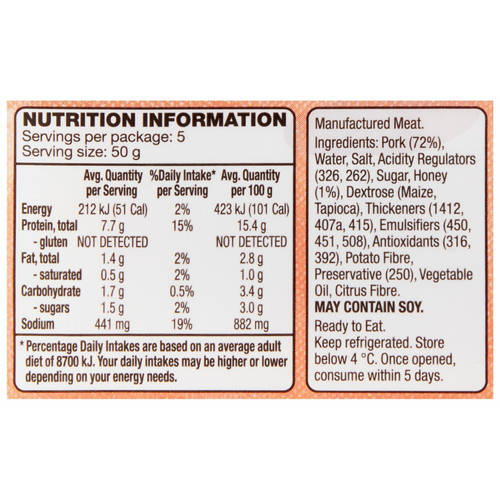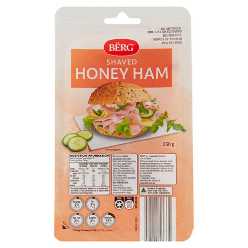 Shaved honey ham. A great source of protein that is 97% fat free. No artificial colours or flavours. Gluten free.