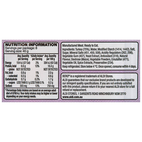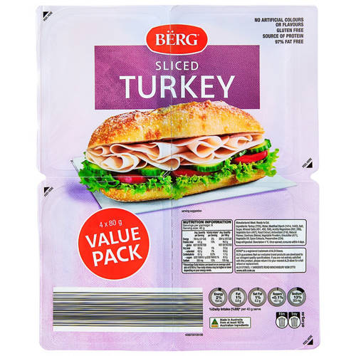 Thinly sliced turkey value pack comes in 4 x 80g easy-to-use cells (320g). Use one and save the rest, fresh, for later.  A great source of protein that is 97% fat free.  No artificial colours or flavours.  Gluten Free