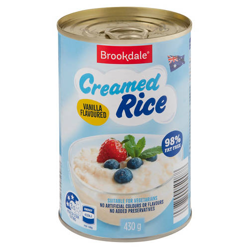 Australian made smooth and creamy vanilla flavoured creamed rice. 98% fat free. No artificial colours, flavours or preservatives. Suitable for vegetarians.