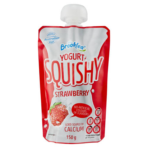 98% fat free Strawberry Yogurt Squishy is a healthy tasty snack made with real fruit, packaged in a convenient pouch, perfect for lunches or on the go snack. No artificial colours, flavours or preservatives. Contains calcium, probiotics and live cultures acidophilus, bifidus and casei. Gluten and gelatine free. Made in Australia.