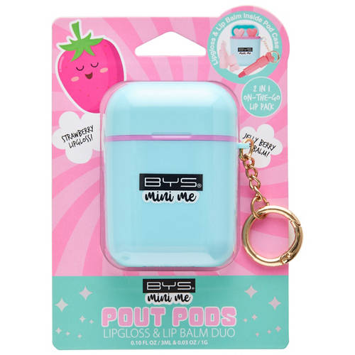 BYS Mini Me Pout Pods Lip Gloss & Lip Balm Duo includes a lip gloss and a lip balm inside a pocket sized carry case. It features a keyring to conveniently attach to your purse or backpack for on-the-go glam. Perfect for adding a juicy hint of colour and moisture anytime, anywhere.