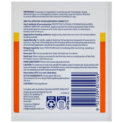Avoid prolonged exposure. Sunscreen is only one part of sun protection, so wear protective clothing, hats and eyewear when exposed to the sun and seek shade. Frequent use and re-application in accordance with the directions are required for effective sun protection.
