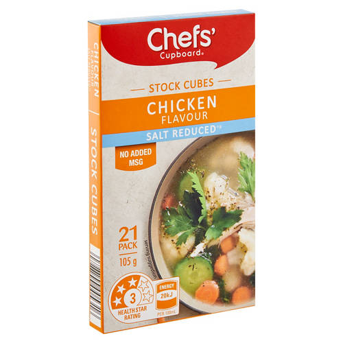 Salt reduced chicken flavour stock cubes can be used to add depth to your stock for soups or to enhance stews, casseroles or marinades. A convenient pantry staple to have on hand. No added MSG and made with no artificial colours, flavours or preservatives.
