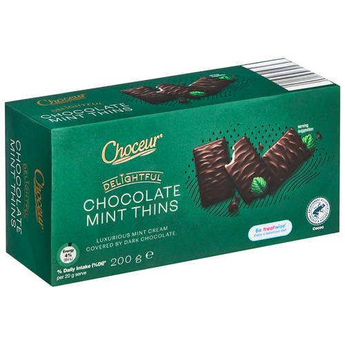 These crisp, delicate thins are coated in smooth dark chocolate and infused with a cool minty finish — ideal for after-dinner treats or anytime indulgence.
