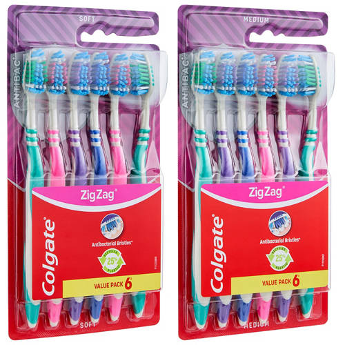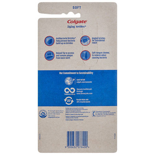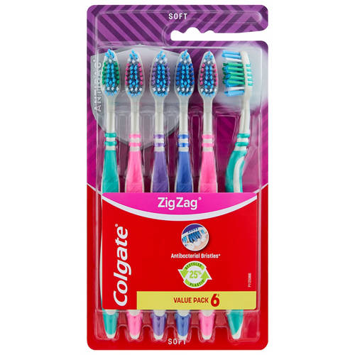 In this 6 pack, each toothbrush has zig zag antibacterial bristles and angled bristles for interdental reach. Also features a raised tip and a soft tongue cleaner to remove odour causing bacteria. The handle is also made with 25% post consumer recycled plastic.