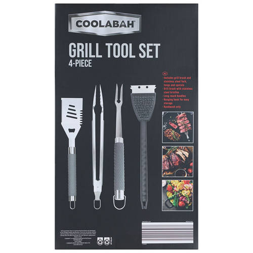 - Includes grill brush and stainless steel fork, tongs and spatula