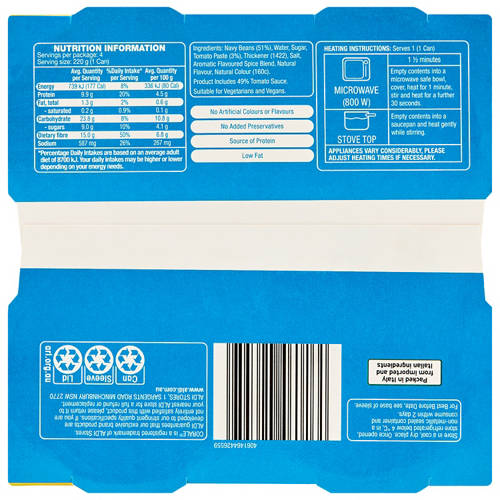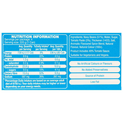 Baked beans in a delectably rich tomato sauce. Best served on toast with eggs or enjoyed by itself. Excellent source of fibre. 99% fat free. Suitable for vegetarians. No artificial colours, flavours or preservatives.