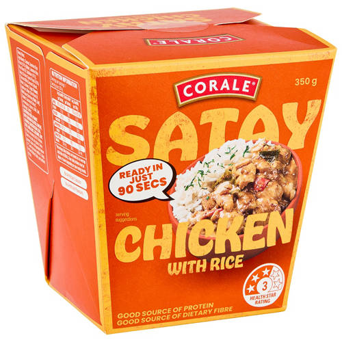 Lunch or dinner made easy with this Corale meal kit, in tasty satay chicken with rice flavour. Ready in just 90 seconds.