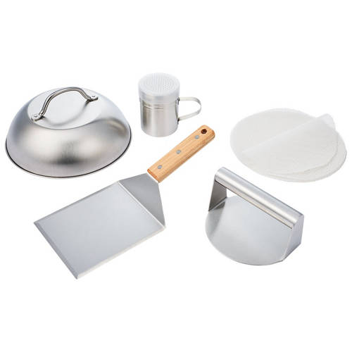 - Kit includes steam dome, burger press, flat spatula, seasoning shaker and silicone liner 6pk