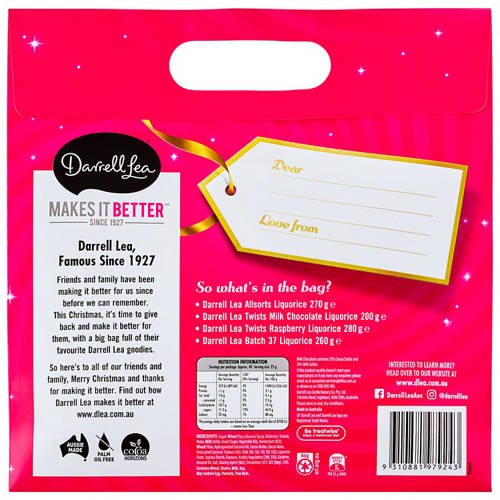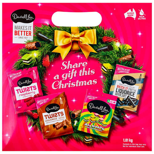 Celebrate the festive season with this 1kg Christmas Bag. Includes all your Darrell Lea favourites - Liquorice 260g, Choc Twists 200g, Allsorts 270g and Raspberry Twists 280g. Perfect for sharing with friends and family.