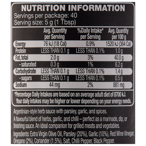Add a zesty, herb-packed kick to your dishes with Chimichurri. This vibrant sauce is perfect for marinating meats, drizzling over vegetables, or serving as a dipping sauce, bringing bold flavour to every bite.