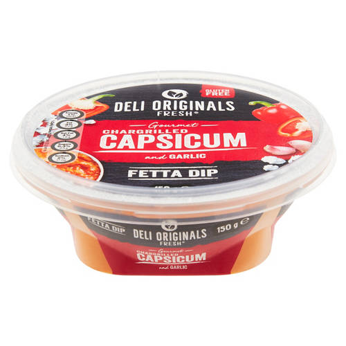 Deli originals capsicum with roasted garlic and feta dip a perfect accompaniment to any cheese platter. No artificial colours, flavours or preservatives. Gluten free.