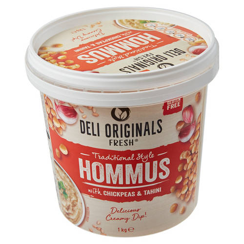 Delicious creamy traditional style hommus with chickpeas and tahini. 1kg tub perfect for parties. Gluten free and dairy free. No artificial colours or flavours.