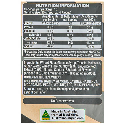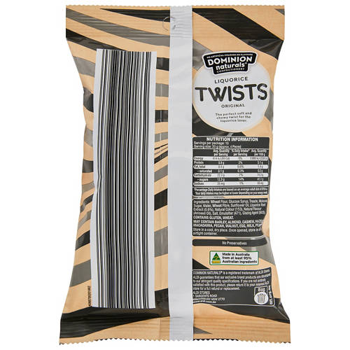 Original flavoured black liquorice twists. Made in Australia and contains no artificial colours, flavours or preservatives.