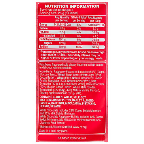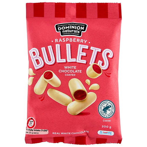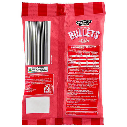 Delicious raspberry liquorice bullets coated in creamy white chocolate.