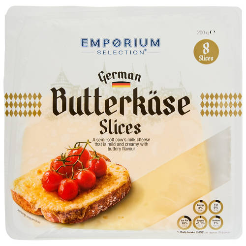 Butterkase cheese slices are a semi-soft cow's milk cheese with a mild and creamy texture. Made in Germany, they offer a rich buttery flavor that's perfect for sandwiches and snacks.