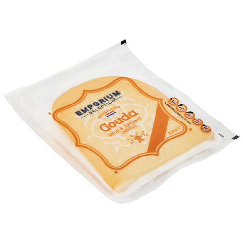 Mild Creamy Dutch Gouda Cheese Portion is a mild and creamy cheese crafted from pasteurised cow's milk, perfect for everyday snacking or enhancing gourmet dishes. It has no artificial flavours and is suitable for vegetarians. A delightful addition to sandwiches or grated over meals, it's source of protein and calcium with a smooth, rich flavour.