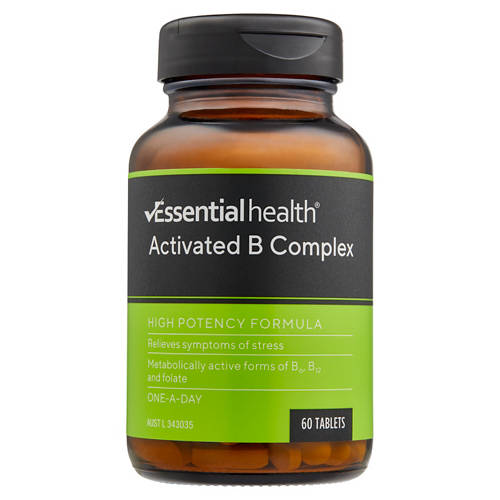 Essential Health Activated B Complex Vitamins relieves symptoms of stress. Metabolically active forms of B6, B12 and folate. 60 tablets. One-a-day.