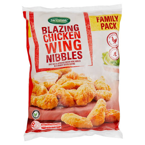Spicy chicken wing nibbles in a crunchy golden coating. No artificial colours or flavours.No added hormones. Good source of protein.