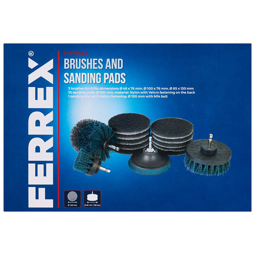 Includes 3x drill brushes, 10 sanding pads and 1 sanding disc with M14 bolt.