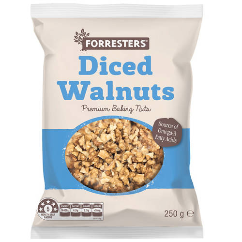 Perfectly chopped for easy mixing, Forresters Diced Walnuts are ideal for baking, cooking, or sprinkling over breakfast bowls and salads. With a rich nutty flavour, they are also a great source of Omega-3 fatty acids.