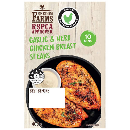 Marinated Chicken Breast Steaks are made with RSPCA Approved chicken and no artificial colours, flavours, or added preservatives.