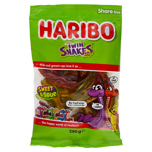 Savour HARIBO's Twin Snakes. Deliciously sweet and sour gummy candies. Perfect for sharing or enjoying on your own, they brighten any moment!