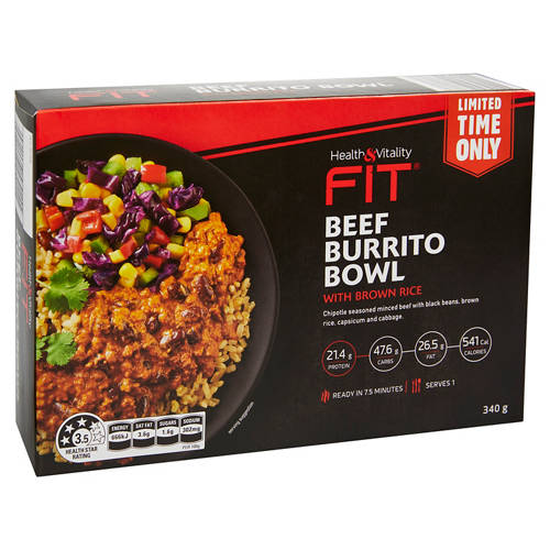Health & Vitality Fit Beef Burrito Bowl is a convenient meal option that features seasoned beef, rice, and a mix of vibrant veggies. It's designed to offer a balanced and flavourful meal that's easy to enjoy on the go.No artificial colours and no added preservatives.Good source of protein.Excellent source of dietary fibre.