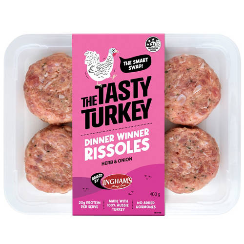 Delicious herb & onion turkey rissoles, perfectly cooked pan fried, grilled or on the BBQ. Made with 100% Australian Turkey.