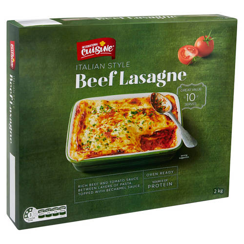Rich beef and tomato sauce between layers of pasta topped with bechamel sauce. No artificial colours or flavours. Source of protein and dietary fibre.Made with Australian beef.