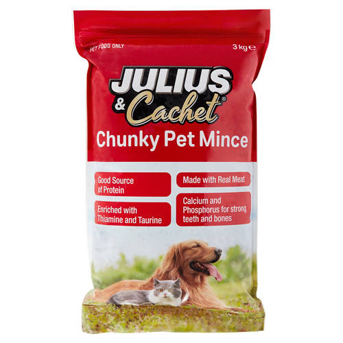 Julius & Cachet Chunky Pet Mince is proudly Australian made that provides your pets a good source of protein. Enriched with Thiamine and Taurine. Suitable for both dogs and cats. Feed as part of a complete and balanced diet.