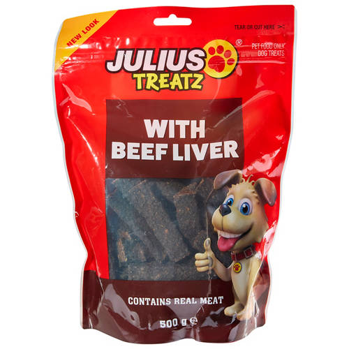 Julius® Dog Treatz with Beef Liver contains real meat and nutrients such as Omega 3 Fatty Acids and Omega 6 Fatty Acids for healthy and shiny coat conditions. No artificial colours or flavours. This is a good source of protein, calcium and phosphorus.