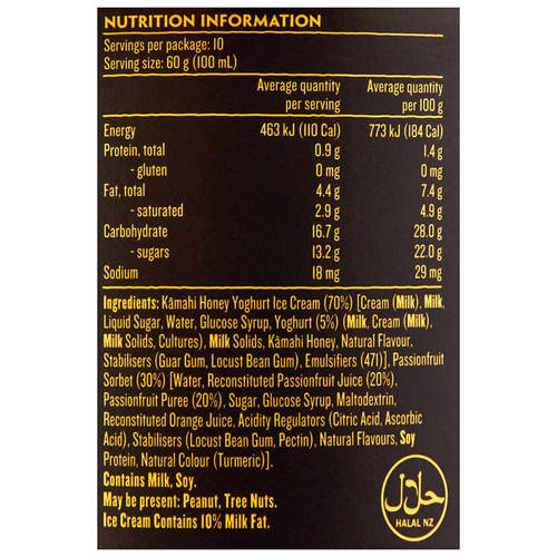 New Zealand Kamahi Honey Yoghurt Ice Cream, swirled together with a refreshingly vibrant Passionfruit Sorbet.