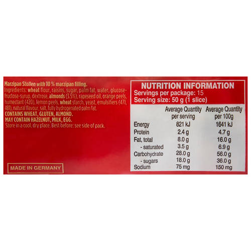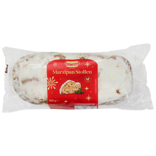 Indulge in the traditional taste of the holidays with Kuchenmeister’s Marzipan Stollen. This authentic German festive loaf is packed with juicy raisins, candied fruit, and a decadent ribbon of smooth marzipan at its centre — all dusted in a snowy layer of powdered sugar. Moist, rich, and beautifully aromatic, it’s a must-have for any Christmas celebration.