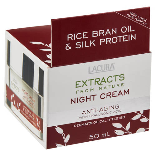 LACURA Extract From Nature Night Cream is a lightly scented, rich moisturising night cream, to help restore essential moisture loss. Its unique blend of naturally derived, traditional and modern active ingredients soothes and moisturises the skin and helps protect against environmental influences. It contains highly effective Hyaluronic Acid, which is naturally produced by the body. It works by plumping the skin, increasing skin elasticity and helps minimise the appearance of fine lines and deep wrinkles. It contains Rice Bran Oil and Sweet Almond Oil which are rich in essential fatty acids, providing deep hydration while you sleep and silk proteins with known antioxidant properties to help counteract skin ageing. Dermatologically Tested. Paraben Free. pH Balanced.