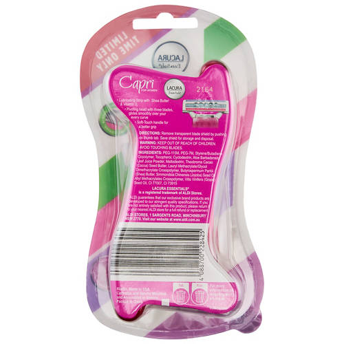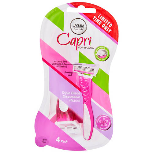 Lacura Essentials Capri Women's 3 Blade Disposable Razor 4pk features a lubricating strip with Shea Butter & Vitamin E and soft touch handle for a better grip. The pivoting head with three ceramic coated blades allows it to glide smoothly over your every curve.