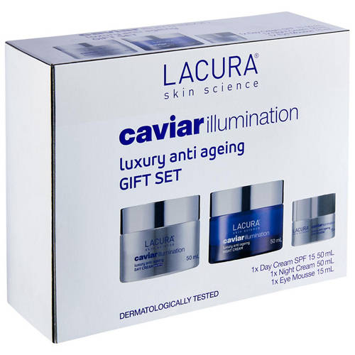 Experience luxurious skincare with the LACURA® Skin Science Caviar Illumination range, specially formulated for women 40+. This premium anti-ageing set features caviar extract—rich in proteins, vitamins, and minerals—alongside snow algae extract to help stimulate collagen synthesis and reduce visible signs of ageing. The set includes: