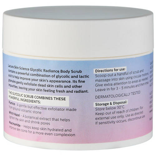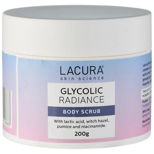 Lacura Skin Science Glycolic Radiance Body Scrub contains a powerful combination of glycolic and lactic acid to help improve your skin’s appearance. Its fine granules gently exfoliate dead skin cells and other impurities, leaving your skin feeling fresh and radiant.
