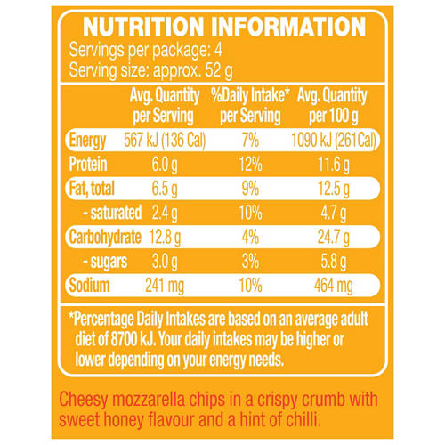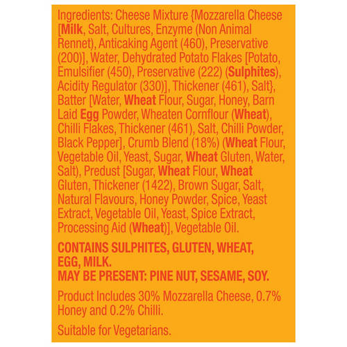Cheesy mozzarella chips in a crispy crumb with sweet honey flavour and a hint of chilli. Ready in 6 minutes.