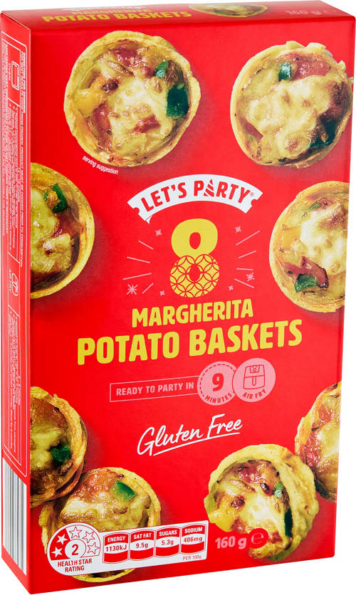Crispy Potato baskets filled with a blend of vegetables and melted cheese. Gluten Free and Ready in 9 minutes, These are perfect for any event.