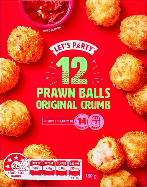 Tender prawn meat formed into balls, lightly seasoned and coated with golden crumb. Ready in 14 minutes, they are a classic Christmas finger food for holiday parties and seafood platters.